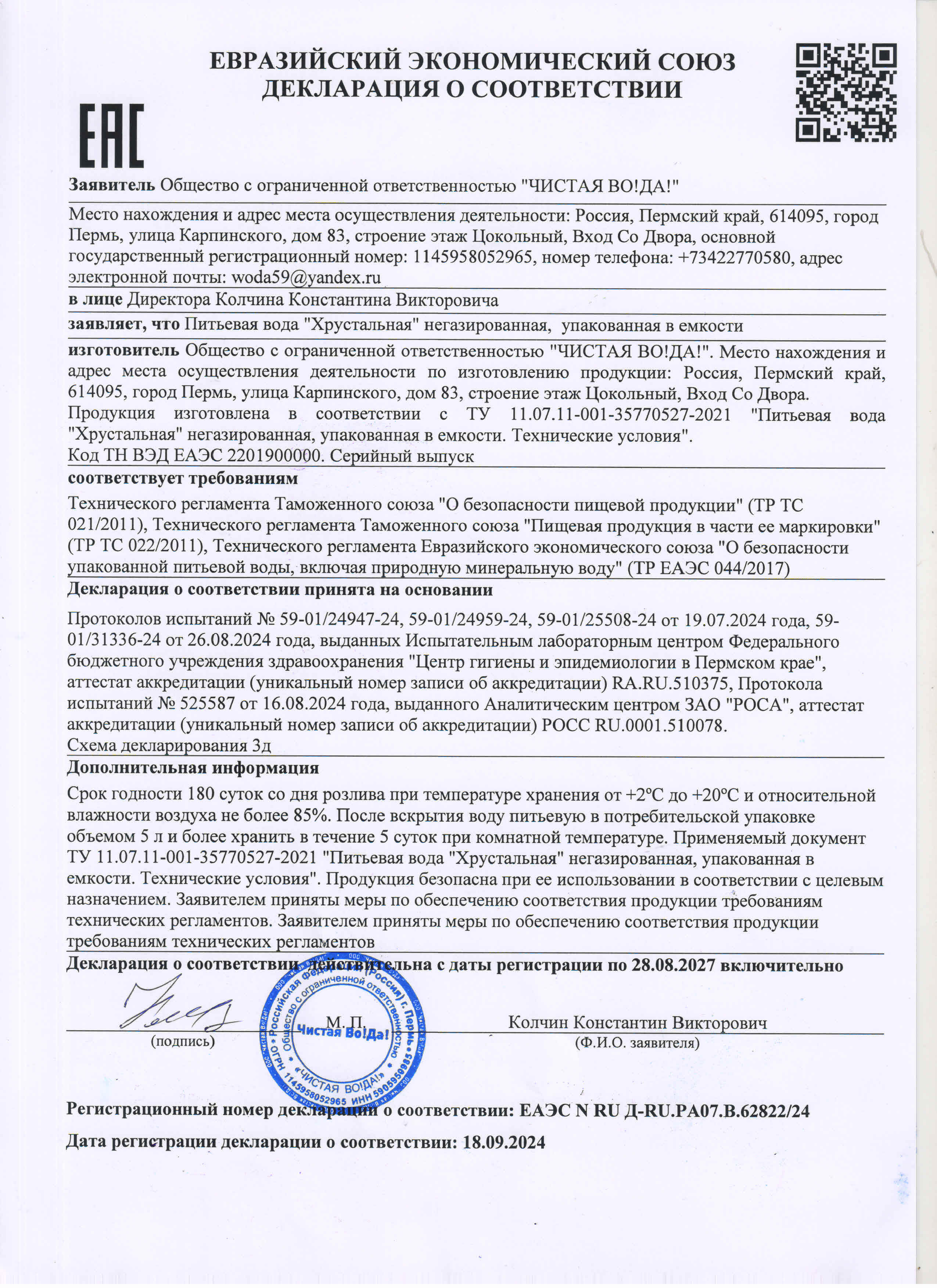Вода питьевая негазированная 1 категории качества "Хрустальная"